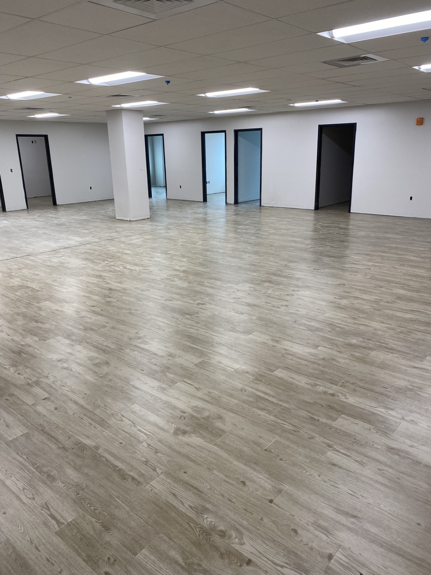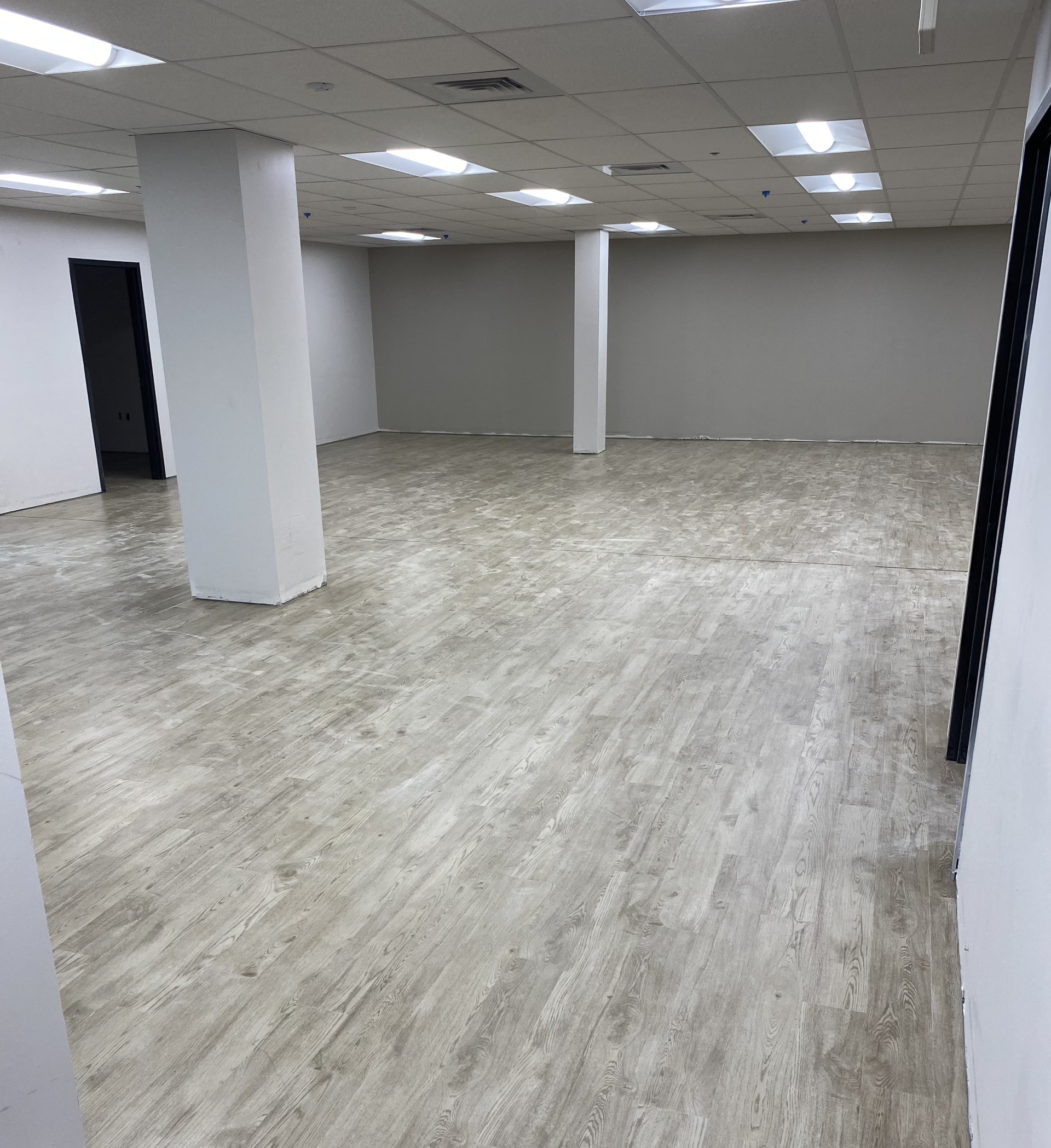 We began with comprehensive moisture mitigation to protect all surfaces from future damage and ensure longevity. Polished concrete was installed in high-traffic areas to provide a sleek, low-maintenance finish. Rubber flooring was added to training and fitness zones for shock absorption and safety. Offices and administrative spaces received a warm upgrade with durable wood laminate flooring.